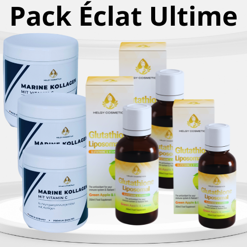Découvrez le Pack Éclat Ultime, une combinaison puissante de 3 boîtes de Glutathion Liposomal et 3 boîtes de Collagène Marin Hydrolysé, spécialement formulée pour vous offrir une peau éclatante de santé et une beauté radieuse de l'intérieur.